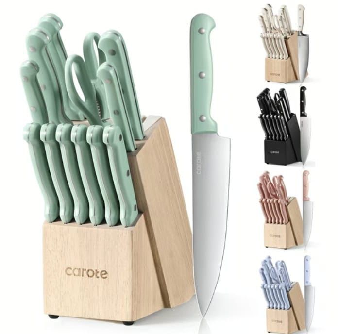 Turn your kitchen into a chef’s playground with this all-in-one knife set that’s sharper than your wit. These forged stainless steel blades slice through veggies, meat, and anything in between like a hot knife through butter — and they laugh in the face of rust and corrosion. Plus, the sturdy wooden block keeps your knives organized and your countertop looking chef’s kiss clean and classy.