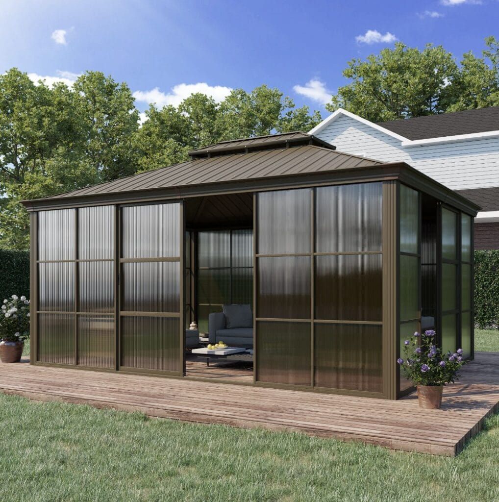 Bring the outdoors in with the stunning Richryce 10′ x 16′ Solarium Sunroom, available at Walmart! This elegant sunroom offers a perfect, all-season extension to your home, transforming any patio or deck into a versatile living space. Featuring a durable hardtop polycarbonate roof and a sturdy aluminum frame, it’s designed to withstand various weather conditions. The lockable sliding doors provide easy access and security, while the spacious interior is ideal for a lounge, studio, or entertaining. Enjoy natural light and beautiful views year-round in this exquisite addition, making it a truly exceptional home find.
