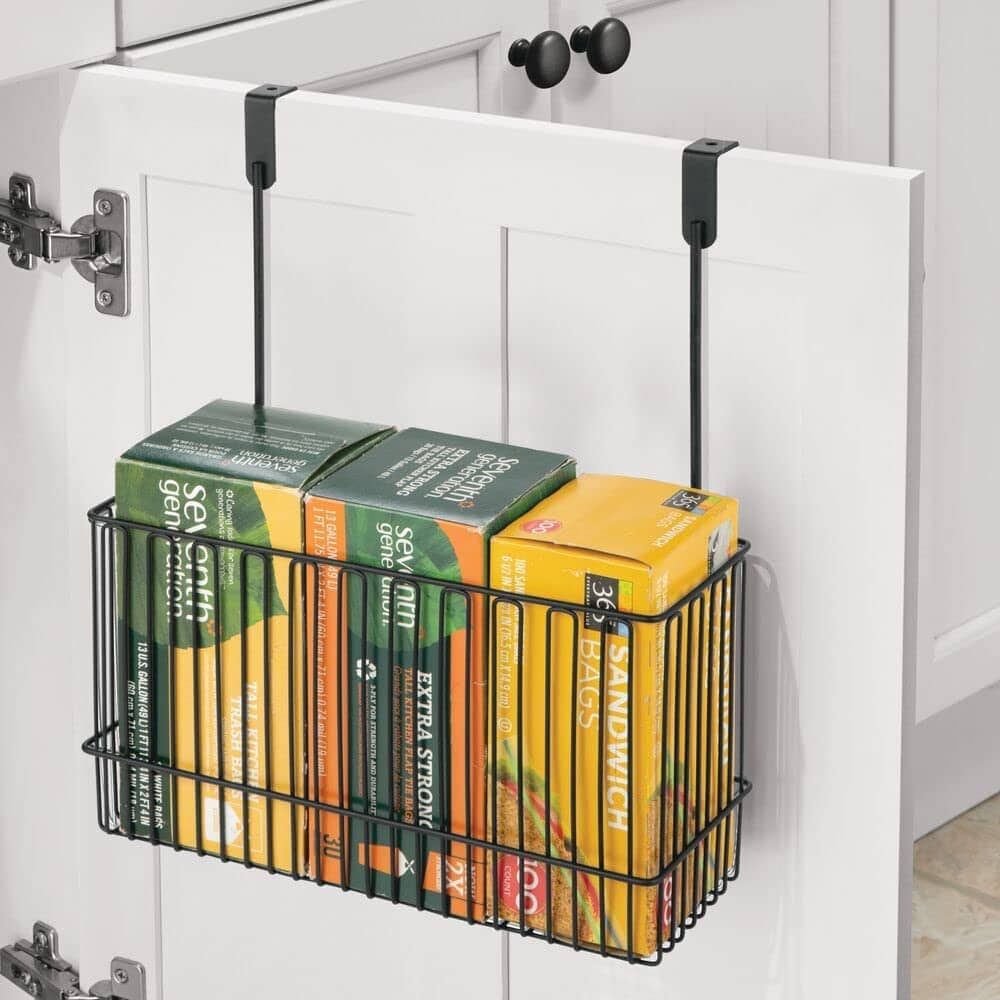 Whether you’re storing your trash bags, sandwich bags, cutting boards, cookbooks, or cleaning supplies, this organizer is great for over-the-cabinet storage.