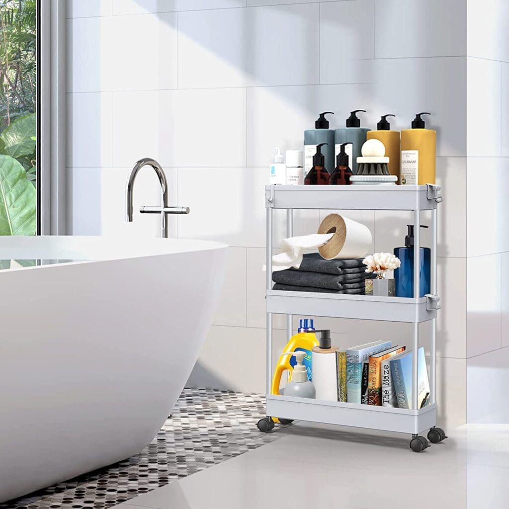 I live in a one-bedroom condo that is short on storage, so I own a majority of the items on this list. But I have to say, this rolling cart is one of my favorite space-saving items on this list. I keep it in my bathroom for hair products and other miscellaneous toiletries. Because it’s so narrow, I barely notice that it’s there!