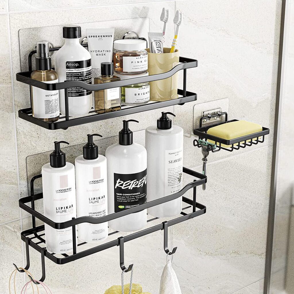 Reviews say, “The price is perfect. The adhesive is very strong. If you are obsessed with organization and a cluster-free shower or bathroom, then this is for you. I absolutely hate the mess that shampoo bottles leave on the tub ledge. This eliminates water getting into the lids of the top-side-down shampoo and conditioner containers. Why am I so late in buying this? I placed it on the back of the shower as opposed to under the shower head or the sides. Trust me, it makes sense.”