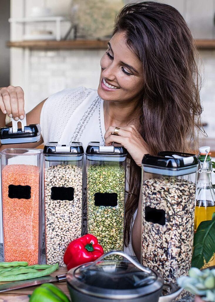To Marie Kondo your pantry and maximize the space, use these food storage containers which are great for dry items such as rice, cereal, pasta, oatmeal, and more. They even come with chalkboard labels.