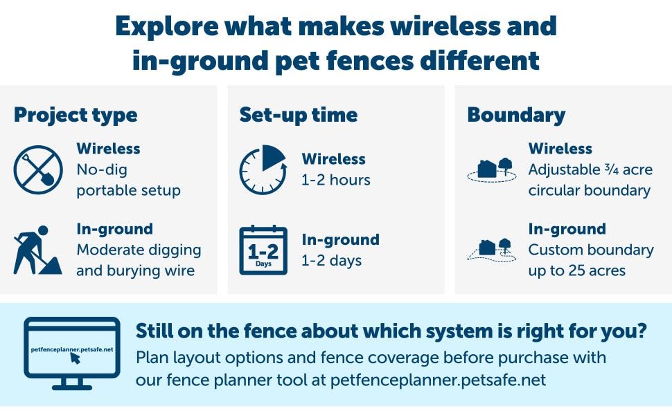 - No digging or wire to bury: Set up your pet-safe zone in just a few hours. The wireless boundary allows you to create a secure barrier around your yard without the hassle of burying wires.