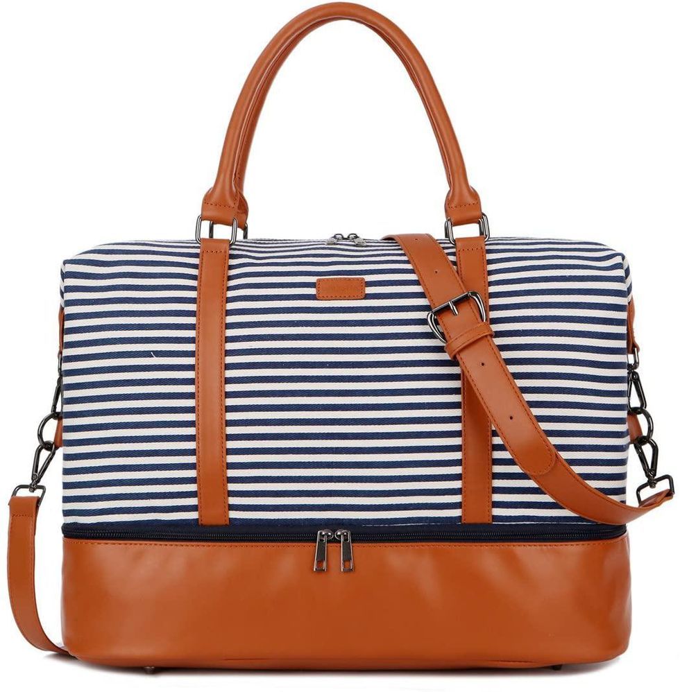 I have to say this first: my favorite thing about this bag is the super cool shoe compartment at the bottom. It keeps your shoes (or sweaty gym clothes) separate from the other items in your bag. How smart is that? Of course, you can’t overlook the fact that this bag is way cute, with a blue-and-white stripe canvas body and faux leather trim. I make this my go-to bag for days when I need to lug a lot of stuff around (laptop, gym clothes, paperwork, etc.) or when I’m headed out of town for the night.