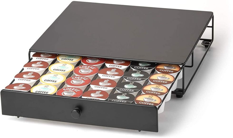 If you like a lot of different flavors of coffee but find it a challenge to store everything neatly and still be able to reach everything, this rolling coffee pod drawer will solve all your problems. (O.K., maybe not all your problems, but at least your coffee problems.) This drawer holds up to 36 pods, and its design allows you to place it right under your existing coffee pot without taking up extra room.