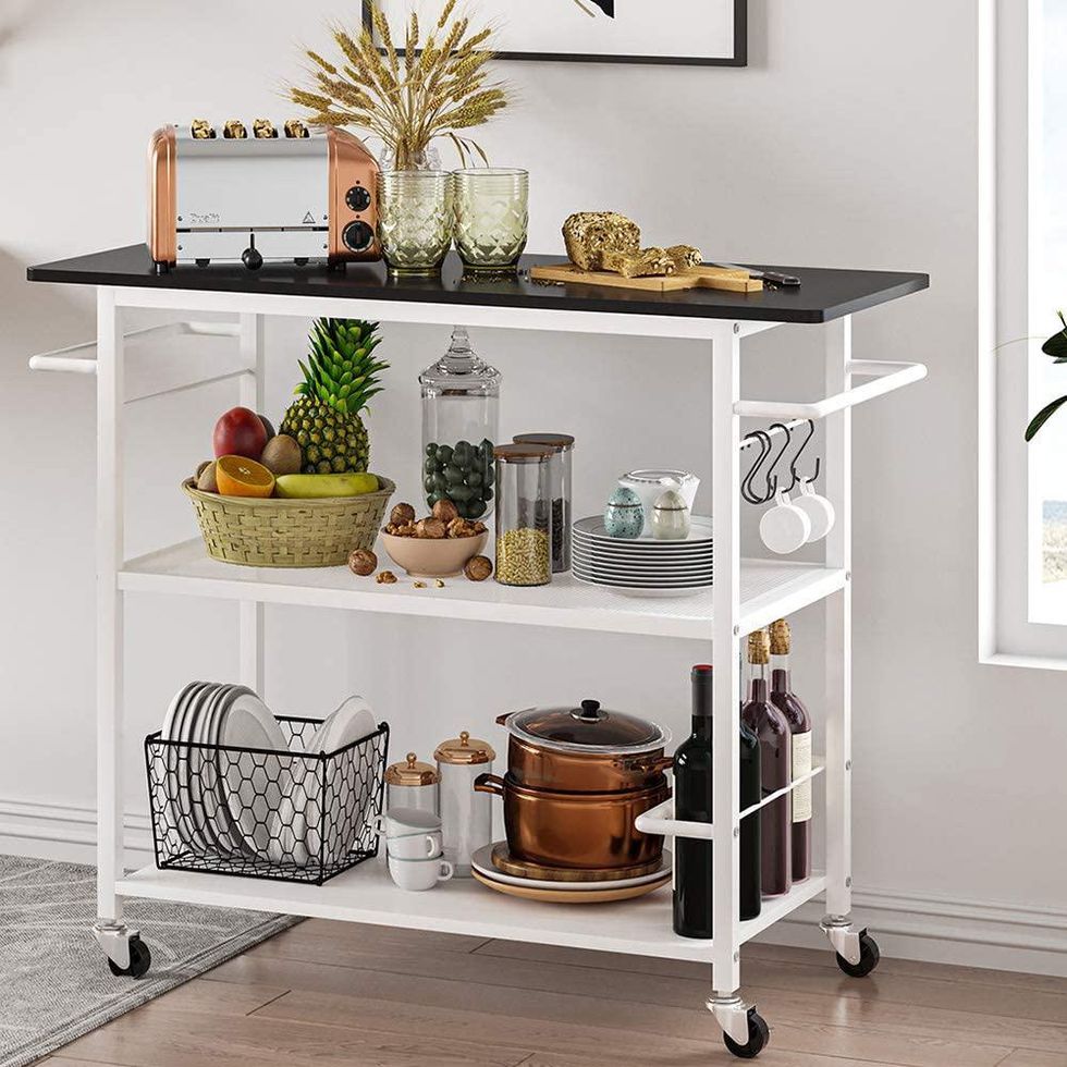 If you’ve always lusted after a kitchen island, but just don’t have the room, let me present your “happy medium.” This rolling kitchen cart island gives you the extra room you need without taking up a lot of — well — room. Get your microwave off of your kitchen counter to free up space there or keep dishes or pots and pans easily within reach. It’s available with either a natural brown or black top.