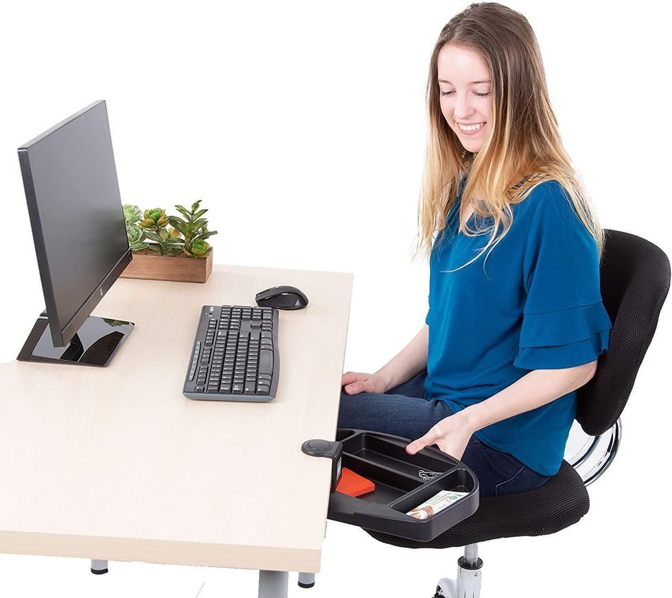 What do you do with those few desk accessories you need within reach but also out of your way? Try this clamp-on swivel organizer that attaches to a desk, but can be turned out of the way as needed. With space for things like pens and pencils, rubber bands, and paper clips, it keeps things handy. If you want to feel really productive, put your phone in there, and then swivel it under the desk. I double-dog dare you.