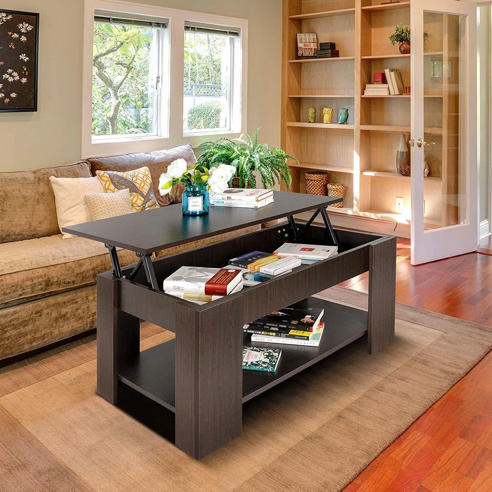 I visited someone’s home once upon a time where they had one of these lift-top coffee tables, and I thought it was the coolest. I know what you’re thinking: Why can’t you just put your stuff on the top of the table? The quick answer is that you lose a working surface for, say, your dinner or a laptop. With this design, you can still store necessary items in the hidden compartment and have the top of the table accessible for other activities.
