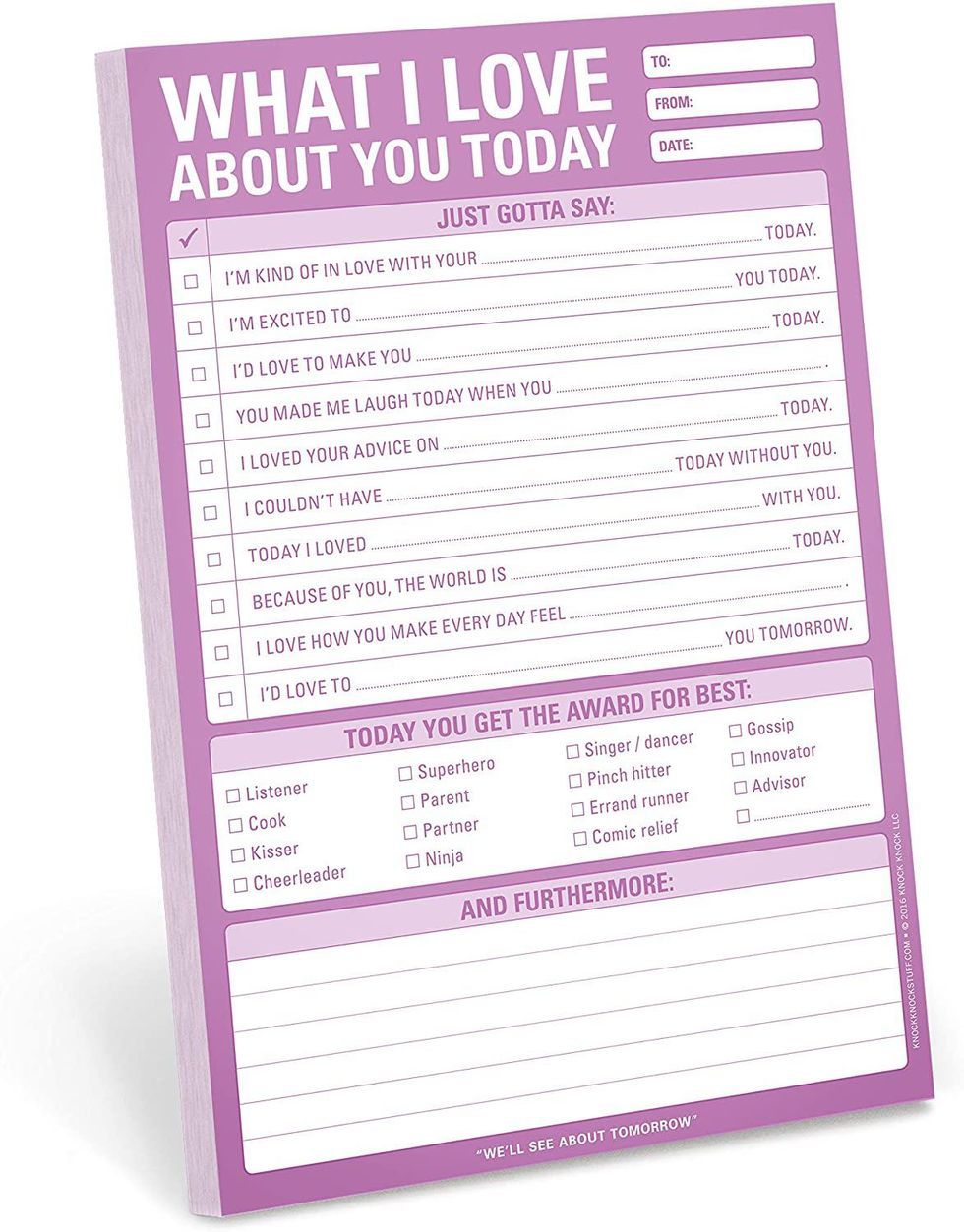 You’ve probably seen these notepads in other forms, like check-off packing lists for a trip or a “Don’t kill the kids” note for the babysitter. This one is all about love, where you can tell your partner what you love about them and why. Each pad comes with 60 sheets, perfect to hide away and break out 60 different times. I recommend sticking one on the bathroom mirror before he or she is out of bed.